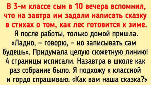 В 3-м классе сын в 10 вечера вспомнил, что на завтра им задали написать сказку в стихах о том, как лес готовится к зиме. Я после работы, только домой пришла. «Ладно, — говорю, — но записывать сам будешь». Придумала целую сюжетную линию! 4 страницы исписали. Назавтра в школе как раз собрание было. Я гордо так подхожу к классной и спрашиваю: «Как вам наша сказка?» А она отвечает, что не проверяла еще и вообще было задано четверостишие написать. Занавес. © gloria__laurel Сыну нужно было в 4-м классе сделать презентацию и классу дать прослушать отрывок песни про весну...