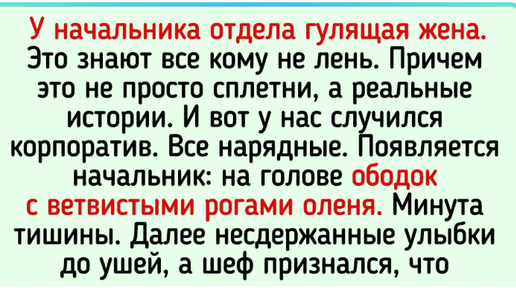 У начальника отдела гулящая жена. Это знают все кому не лень. Причем это не просто сплетни, а реальные истории. И вот у нас случился корпоратив. Все нарядные. Появляется начальник: на голове ободок с ветвистыми рогами оленя. Минута тишины. Далее несдержанные улыбки до ушей, а шеф признался, что узнал про измены, подал на развод. Сказал: «Я столько лет ходил с рогами, могу и еще один вечер побыть с ними». Опоздала на работу. В объяснительной написала: «Дома три кота и жадная собака. Не могла уйти, пока коты не доедят — иначе собака слопала бы всю их еду»...
