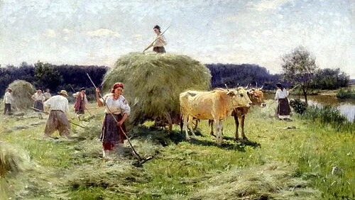К обеду солнце раскалилось до бела. Даже тень от стогов не спасала — воздух стоял плотный, горячий, как из печи. Бабы попрятались кто куда: Аграфена уползла под телегу, Маланья приткнулась у куста ракиты, Марфа старая вовсе уснула сидя, свесив голову на грудь...
