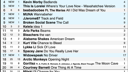 Группа THE STROKES удерживает первое место с песней "Going Shopping". В первую десятку также вошли KEVIN MORBY, THIS IS LORELEI, MUNA, JJEROME87, BROKEN SOCIAL SCENE и WIDOWSPEAK. GREGORY ALAN ISAKOV, EA OTHILDE и OXIS впервые попадают в чарты. Дольше всех - 13 недель в чарте сингл у Arctic Monkeys и 11 недель - у Mitski. На этой неделе в чарте появилось 14 новых треков (на прошлой - 19). Обратите внимание - специально для тех, кто хочет услышать только самое важное. Слушайте ниже эти новые синглы в первую очередь: 1...