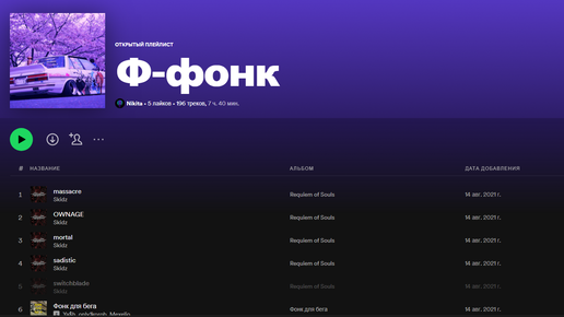 Всем привет, в этой статье я не буду ничего рассказывать, просто предоставляю к вашему вниманию свой плейлист с треками жанра Фонк Плейлист в Spotify Плейлист в Яндекс Музыке Приятного прослушивания!