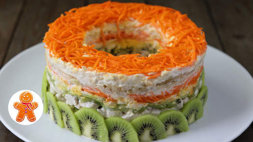 Сегодня я готовлю слоеный салат, в составе которого очень разные по вкусу ингредиенты. Это и отварная курица, и яблоко, и киви, и морковь по-корейски, и немного чеснока в заправке. Ингредиенты действительно очень разные, на мой взгляд, они гармонично сочетаются и в результате получается очень яркий и по вкусу, и по цвету оригинальный и вкусный слоеный салат. Давайте приготовим! Ингредиенты: