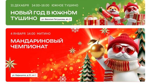 ! 🎄 ✨ Заряжайся Новым годом с нами! ✨ ❄️ Отличный повод собраться вместе, насладиться зимой и поймать новогоднее настроение 🎁 📍 Что вас ждёт: 🎆 31 декабря | 14:00–16:00 🎄 Новый год в Южном Тушино 📌 ул. Василия Петушкова, вл. 2 🍊 4 января | 14:00 🏆 Мандариновый чемпионат 📌 Митино, ул. Барышиха, д. 33, вл. 1 ⛸️ 6 января | 14:00 🧙‍♀️ Баба Яга на льду 📌 Митино, ул...