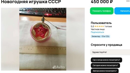 На одном из популярных сайтов объявлений появилось необычное предложение для воронежских коллекционеров. Новогодняя игрушка «50 лет Советской Власти» выставлена на продажу за 450 тысяч рублей. Автор объявления позиционирует украшение как эксклюзивный экземпляр. По описанию продавца, это круглая ёлочная игрушка, в центре которой выбита звезда и цифра «50». Такие украшения выпускались ограниченными тиражами к юбилейным датам и сегодня представляют интерес для коллекционеров советского антиквариата...