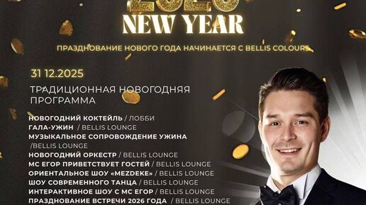 ✨ Традиционная Новогодняя программа в Bellis Deluxe Hotel ✨ 🌲🌲🌲🌲🌲 Встречаем 2026 год в атмосфере тёплого, душевного праздника с гала-ужином, живой музыкой, яркими шоу и настоящим новогодним настроением. 🎄 Программа для Взрослых: * Новогодний коктейль в лобби * Праздничный гала-ужин в Bellis Lounge * Живое музыкальное сопровождение * Новогодний оркестр * Приветствие гостей от MC Егора * Ориентальное шоу «Mezdeke» * Шоу современного танца * Интерактивное шоу с MC Егор * Празднование наступления...