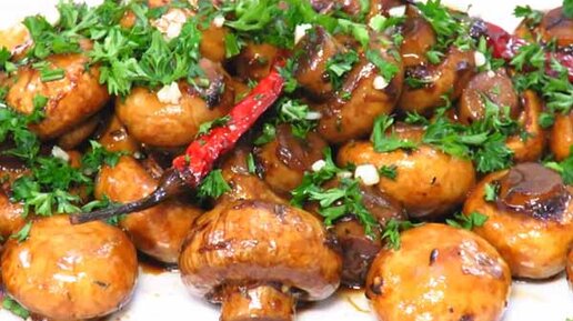 Оригинальная закуска из шампиньонов на новогодний стол. Грибочки получаются нежные и вкусные, в любом виде, обязательно попробуйте. Необходимые ингредиенты для закуски: · Грибы – 450 гр. (я беру шампиньоны небольшого размера, крупные можно разрезать пополам или на 4 части); · Петрушка – на ваш вкус; · Чеснок – 4 дольки (крупного можно 2-3); · Соус соевый – пара ст. ложек; · Уксус бальзамический – пара ст. ложек (яблочный или рисовый); · Тимьян – одна ч. ложка сушёного; · Сахар – одна ч. ложка; · Масло растительное – пара ст...