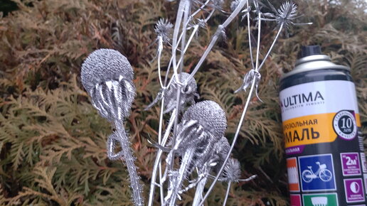 Новогодний букет за 15 мин из того, что растет в саду Нам понадобится немного лапника. Подойдет любая пихта, сосна или ель. Сухие соцветия гортензии, лука, рудбекии, синеголовника, мордовник и пр. У меня еще есть ветки лиственницы с шишками и множество шишек разного размера После того, как букет будет готов, его можно украсить елочными игрушками и мишурой Главный компонент преображения сухоцветов в волшебные растения - баллончик с краской...