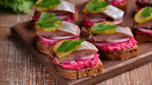 Потрясающе вкусные и красивые закусочные бутерброды с селёдкой и свёклой. Остроту закуске добавляет репчатый лук, пикантный вкус солёный огурец. Чтобы основа из свёклы стала сочной, дополняю её майонезом. Из простых ингредиентов получаются ароматные и яркие мини-бутерброды, которые станут украшением праздничного стола. Порции 12 шт. Время подготовки 50 минут Время приготовления 10 минут Ингредиенты Инструкции 1. Свёклу промываем с губкой и варим в воде 40-45 минут. На готовность проверяем ножом...