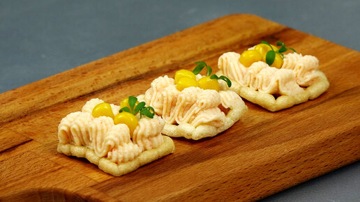 Покажу сразу три закуски. Мини-бутерброды на праздничный стол. С крабовой пастой, которая готовится элементарно, канапе с печеночным паштетом и вариант с красной рыбой. Первая закуска. В чашу блендера отправляю крабовые палочки, вареное яйцо, немного сыра и чуть-чуть майонеза (или сметаны). Измельчаю это все. Должна получиться нежная и очень вкусная однородная паста. С помощью кондитерского шприца выкладываю пасту на греночки. Я использую хрустящие снеки. Можно также взять какие-нибудь несладкие крекеры...