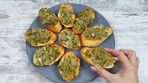 Как готовить: 5 солёных огурчиков натираем на мелкой тёрке. 1 луковицу нарезаем на кубики. Обжариваем лук на растительном масле несколько минут. 2 зубчика чеснока выдавливаем через чеснокодавилку или натираем на мелкой терке. Из натёртых огурцов отжимаем жидкость. И отправляем в сковороду к луку. Добавляем пол чайной ложечки черного перца. Перемешиваем и тушим овощи 3-4 минуты. Багет нарезаем на ломтики. Поджариваем их с двух сторон на сковороде без масла до слегка золотистого цвета. На каждый подсушенный ломтик хлеба намазываем зажарку с огурчиками...