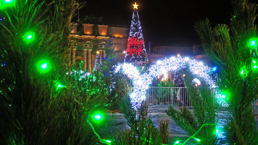 Продолжаю фотопрогулки по новогодней Самаре. Мы осматриваем центральную площадь города - площадь Куйбышева. Главным украшением в новогодние праздники, конечно, становится ёлка. Последние несколько лет здесь их даже не одна, а целых семь. Строго говоря, это не ёлки, а световые конструкции конической формы. Внешняя сторона их состоит из лампочек, которые позволяют транслировать различные динамические картины и узоры. Высота самой высокой - 26 (по другим источникам 25) метров, ещё две имеют 11 метров в высоту, остальные - по 7 метров...