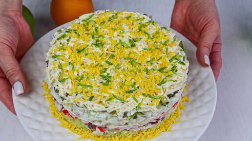Отличный слоеный салат с крабовыми палочками на праздничный стол