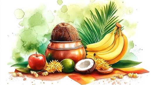 Создано на основе запроса: Tamil New Year watercolor card design with beautiful arrangement. Follow exact style for the kalasam with coconut, indian banana, apple and fruits. South Indian style --- Автоперевод: Тамильский новогодний акварельный дизайн карт с красивой аранжировкой...