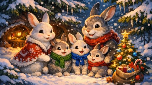 В тихом зимнем лесу, под пушистыми елями, жила-была дружная семья зайчат: мама Зайчиха, папа Заяц и их трое маленьких сыновей - Пушок, Прыгунок и Хвостик. Они очень ждали Новый год! Однажды, накануне праздника, братья поспорили. Пушок хвастался, что получит от Деда Мороза самую большую морковку, потому что он самый воспитанный. Прыгунок утверждал, что подарки достанутся ему, ведь он самый быстрый и всех перегоняет. А Хвостик, самый маленький, тихонько надеялся на чудо, но ничего не говорил. Мама...