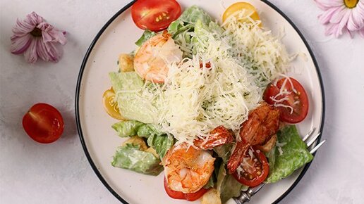 Салат «Цезарь» с креветками — одна из разновидностей классического «Цезаря» с курицей. Только здесь вместо курицы используются креветки. В оригинальном же рецепте салата не было ни курицы, ни креветок. В 1924 году его создатель Цезарь Кардини смешал сухарики (пшеничные крутоны), листья салата, пармезан и соус. Получившийся лёгкий и свежий салат назвали именем автора. Со временем в него добавили яйца и курицу, чтобы сделать блюдо сытнее. «Цезарь» с креветками не имеет классического рецепта. В его основе лежат те же принципы, что и в салате с курицей: крупная нарезка, сухарики, соус «Цезарь»...