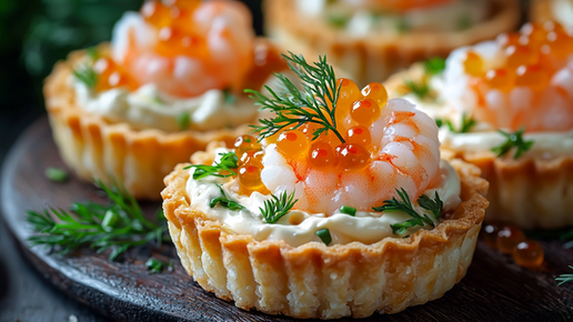 Подаем тарталетки с икрой, твердым сыром и креветками на праздничный стол
