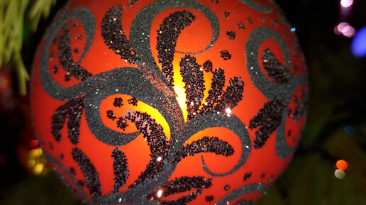 Один из моих любимых ёлочных шаров. Чёрные блёстки на алом матовом стекле выглядят очень необычно. Я больше никогда не видела игрушек с таким блеском. Если у кого-нибудь есть с чёрными блёстками, поделитесь, пожалуйста, в комментариях...