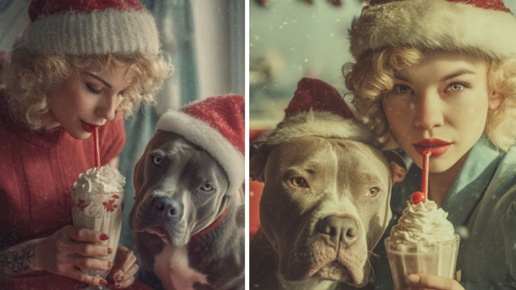 : hyper-realistic photograph of a young woman sitting next to a pit bull dog, both wearing Santa Claus hats, drinking a milkshake with whipped cream and a red straw, stylized in the vintage of the 1950s, the atmosphere of winter and Christmas, falling snow is visible outside the window, natural lighting with a soft warm glow, cinematic depth of field, detailed features...