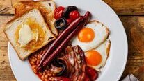 1. English breakfast Ingredients Chicken egg - 1 pc. Bacon - 2 slices. Cherry tomatoes - 3 pcs Champignons - 4 pcs Canned beans (in tomato sauce) - 50 g Vegetable oil (for frying) Bread (for toast) - 1 pc. Salt (to taste) Black pepper (to taste) Sausage (small, optional) - 2 Cooking instructions 1)First you need to fry the bacon and sausages in a hot frying pan until golden brown. Next, cut the mushrooms into small pieces, and the tomato into two parts, then fry the vegetables in a pan with the addition of vegetable oil...