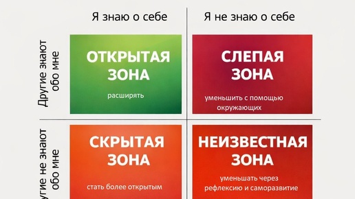 ". Конец года - время подведения итогов, построения радужных планов на будущее и саморефлексии. Сегодня я предлагаю познакомиться с очень сильным инструментом - ОКНОМ ДЖОХАРИ, с помощью которого можно осознать свои сильные и слабые стороны и еще определить, как они воспринимаются окружающими. Помогает улучшить коммуникацию с окружающими в т.ч. и командам. 🟦 Четыре зоны, в которых мы живём: 🟩 1. ОТКРЫТАЯ ЗОНА Ты и другие знают это о тебе. Твои очевидные черты: умение решать, сила воли, забота, и даже твои слабости, которые ты принимаешь...
