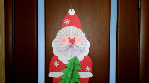 Пора создавать новогоднее настроение своими силами! Особенно, если оно по какой-то причине задержалось)). Предлагаю сделать несложного дедушку для украшения двери. Потребуется цветная офисная бумага, клей-карандаш и немного вашего времени. Начинаем готовить основу для бороды: Использован лист формата А4. Для рук будем использовать красную бумагу тоже А4, которую свернём пополам вдоль длинной стороны. Лучше подклеить по длинному краю. Красную деталь нужно разрезать на две части. И согнуть, обозначив плечи...