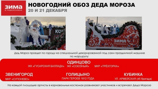 + Дед Мороз и Снегурочка приедут на праздничной машине, декорированной под сани. В программе праздника концерт, игры и хороводы для детей и взрослых. Расписание: Суббота, 20 декабря: • 12:45 — сквер «Союзный», 8 микрорайон Одинцово •...