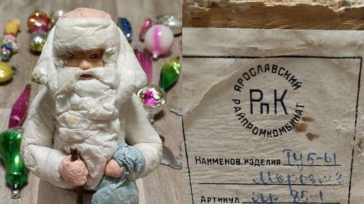 Начало статьи ⏬ Перенесёмся в 1965 год. В начале года этикетки не претерпели существенных изменений. Фабрика находится в ведении Ярославского Райпромкомбината, и на этикетке появился синий штамп ОТК (отдел технического контроля). Однако уже в середине лета 1965 года произошли значительные перемены. Райпромкомбинат был переименован в Ярославскую фабрику №3. Этикетки также обновились, но основные данные остались прежними: Дед Мороз №3, артикул ЯР-85-1 и цена 87 копеек. Сохранилась упаковочная коробка для игрушки, выпущенная в 1965 году...
