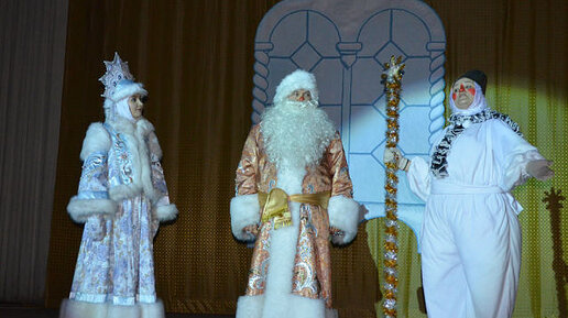 Сцена оформлена, как зимний сказочный лес. Звучит музыка, в лесу со свистом и криками появляются Карга Кащеевна и Поганка Мухоморовна, в руках у них рогатки из которых они, бегая по лесу, стреляют в зрителей, в игрушки которые висят на ветвях елей...