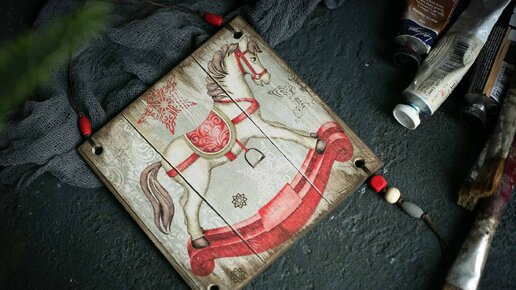 Всем привет! Сегодня мы с вами сделаем милое новогоднее украшения для детской комнаты. Для работы я взяла заготовку панно (квадратик из фанеры 15-15 см с четыремя отверстиями по углам) и салфетку с лошадкой. Заготовку с однйо стороны покрываю белой краской. Это нужно для того, чтобы рисунок на салфетке остался ярким, ведь она очень тонкая и фон обязательно будет просвечивать. Салфетку расслаиваем. Как правило декупажные салфетки состоят из трех слоев, нам нужен только один - верхний. Кладем салфетку...