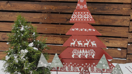 Деревянный декор в саду. Ёлочка с "детками". Хочу рассказать о своем деревянным декором в моем саду. Ёлочка с "детками" Помните из мультика "Падал прошлогодний снег", ёлочка высидела деток, вот такую компанию я и сделала. -Делается очень просто на основу набиваются доски за ранее нарезанные на нужный размер. -Покрасила в текстуролом, цвет рябиновый. Очень захотелось яркости в саду зимой. -Орнамент наносила по трафаретам простой шпаклевкой по дереву...