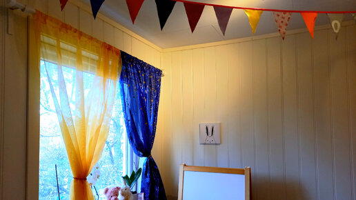 Каждый ребенок любит ощущение праздника и постоянно пребывает в ожидании прекрасного чуда. Мама, как добрая волшебница, может создать теплую атмосферу пока ребенок еще не успел проснуться. Понадобятся ножницы, атласная лента (у меня 2.5 см в ширину), лист картона V-образной формы, разноцветные лоскутки. Размер и форму флажка можно придумать свои или же воспользоваться готовым шаблоном. Замерьте длину ленты для будущего украшения, добавьте припуски на то, чтобы закрепить кнопками или другим, известным вам способом...