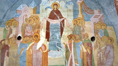Покров Богоматери. Дионисий. Роспись собора Рождества Богородицы Ферапонтова монастыря, 1502 г. Ныне мы, братия, празднуем «Покров Пресвятыя Богородицы». Начало сего празднества, без сомнения, известно вам. Некогда сарацины, народ сильный и воинственный, вторглись в греческую империю и угрожали самой столице ея. Цареградские жители, устрашенные близкою опасностию и видевшие свое бессилие отразить супостатов, обратились к Богу с молитвами о помощи и – Господь явил им ее. Однажды, когда совершалось...