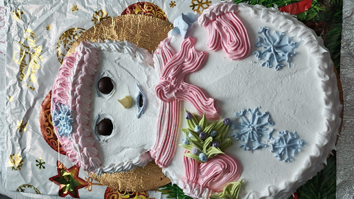 Рецепт бисквита прост: 8 яиц, 1 стакан сахара и 16 ст. ложек муки. Яйца сбиваем миксером до густоты. Добавляем постепенно муку через ситечко, но уже перемешивая лопаткой, а не миксером. Перекладываем тесто в форму. И выпекаем в духовке 35 мин. при температуре 180 градусов. Я испекла два бисквита. На второй бисквит положила тарелку и вырезала ножом круг. Это голова для снеговика. Потом собираем бисквиты. Разрезаем пополам каждый бисквит и пропитываем сиропом. Рецепт сиропа: на пол-литра воды добавляем 100 гр...