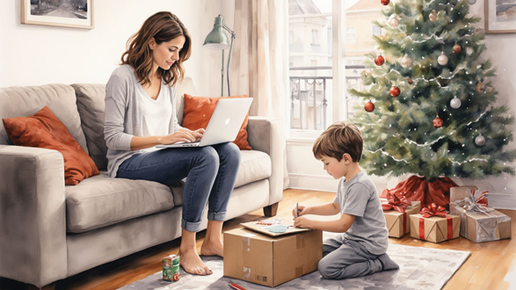 Двадцать четвёртое декабря началось с обманчивого спокойствия. Утро было тихим, светлым, с морозным солнцем, игравшим в кристаллах инея на окне. Ваня, сидя за столом, увлечённо склеивал из картона что-то невообразимое — то ли космическую станцию, то ли новый вид пряничного домика. Таня пила кофе, наслаждаясь редким чувством внутренней гармонии. Ёлка в углу мягко светилась гирляндой-«росинкой», пахло хвоей и вчерашними пряниками. Казалось, все бури позади: отчёт сдан, мир с сестрой заключён, даже ярмарка оказалась не кошмаром, а сказкой...