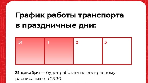 🚃 Все праздничные дни транспорт работает по расписанию выходного дня. Количество автобусов на маршрутах меньше не станет. При этом в новогоднюю ночь автобусы и трамваи ходят аж до 3х ночи — поэтому домой вернуться успеете...