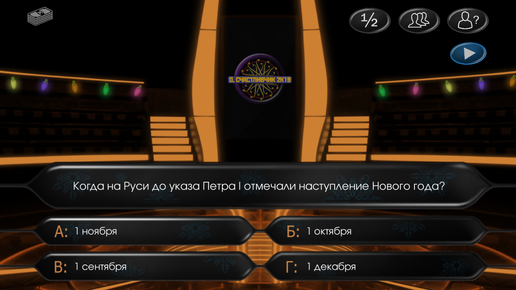 Так когда на Руси до указа Петра I отмечали наступление Нового Года? Уже догадались, какой ответ является правильным? Даны варианты ответов: "1 ноября", "1 октября", "1 сентября", "1 декабря". Правильный вариант ответа – В (1 сентября). 1 сентября на Руси до указа Петра I отмечали наступление Нового Года. Здесь появляются скриншоты из игры для смартфонов "О счастливчик 2k19". Ссылка на скачивание игры: https://play.google.com/store/apps/details?id=com.onemillionairetrivia.m2K20. Друзья, это ссылка на последнюю версию игры...