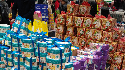 Сегодня я была в магазине Ашан. Покупала продукты и заглянула в отдел с новогодними подарками и украшениями. Народу очень много. Как обычно в последние дни перед Новым годом предпраздничный ажиотаж. Очень много наборов с конфетами. Глаза разбегаются. Надо не торопиться и прочитать состав. И только тогда делать выбор. Упаковка красиво оформлена. На любой вкус. Покупателей уже завлекают ценники со скидками. А вот интересная идея - набор маленьких конфет в упаковке в виде бутылки шампанского. Кому нужны небольшие символические подарки-сюрпризы - тот тоже найдет таких малышей...