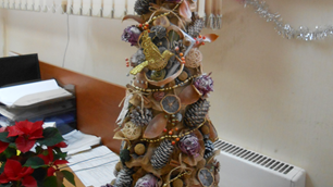 Никогда не думала, что я займусь изготовлением елок. На работе объявили конкурс «Оригинальная елка». Наш отдел решил участвовать, зная о моих творческих способностях. На работу я притащила два больших пакета всего, что только могло бы пригодиться для елки. Я не знала пока из чего она будет и даже не представляла. Захватила еще рулон картона для выкроек (коричневый), на всякий случай. Елку придумывала прямо на работе. Благо работа позволяет. И так в основе свернутый конусом картон для выкроек. Дальше начались муки творчества...