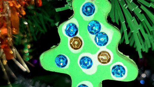 С такими поделками, если, конечно, мама будет помогать, справится каждый малыш. Мы с Ксюшей в этом году делали сначала елочки из воздушного пластилина. Задачу упрощает формочка соответствующей формы. Но если ёлочки у вас нет, то можно взять и что-то другое. Подходящие формы есть в наборах к соленому тесту. Раскатываем не слишком тонко, вырезаем. Я сразу прокалывала иголкой с ниткой, чтобы потом вешать игрушку на елку. Даем высохнуть. Затем наклеиваем клеем ПВА украшения, у нас были пайетки. Нужно что-то блестящее, можно мишуру порезать мелко прямо на клей...