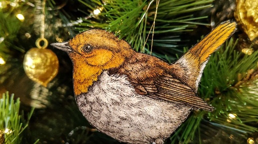 🎄 Я хотела поэкспериментировать с фоном, но мне не понравился результат. А вот сама птичка, наоборот, получилась хорошо, жалко было выбрасывать. Поэтому птичку (это, кстати, японская зарянка) я вырезала, наклеила на прочный картон и покрыла лаком. Ну и последний штрих - золотая ниточка, чтобы вешать на ёлку. Как вам такая идея?...