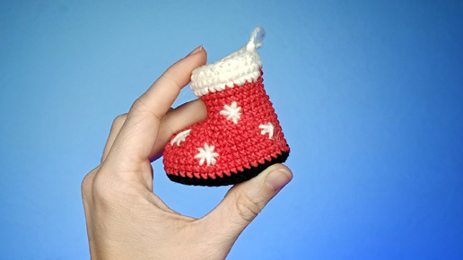Простая в исполнении елочная игрушка, которой можно украсить дом, если есть маленькие дети!) Локация: Удобное кресло (стул, диван и всё, что вы любите), вкусный чаек с печенюшками и самое главное – хорошее освещение для здоровья ваших глаз! Инструменты и материалы 1. YarnArt Jeans. 10 гр – каждого цвета 2. Крючок №2. 3. Ножницы. 4. Игла для вышивания Примерное время работы: 1 час Подошва Набираем цепочку из 10 вп, со второй петли от крючка: 1. Приб, 7 сбн, 4 сбн в последнюю петлю, поворачиваем вязание, продолжаем по обратной стороне цепочки, 7 сбн, приб в последнюю петлю, (22) 2...