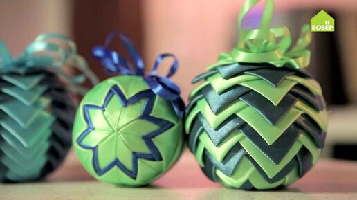 Оригинальное ёлочное украшение, сделанное с помощью атласных лент. Нарежьте ленту на равные части. Булавками без головки закрепите первую ленту на пенопластовом шарике. Возьмите ленту другого цвета, сложите её треугольником и прикрепите на шарик с помощью булавок. Сделайте ряд из лент другого цвета, закрывая ими головки булавок предыдущего ряда...