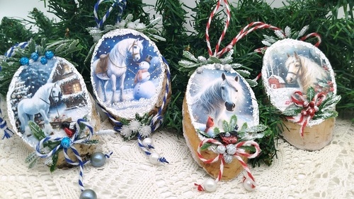 Лето. Однако даже в это время года можно найти интересные идеи для творчества, которые напомнят о новогодних праздниках. Сегодня у меня в планах — изготовление елочных игрушек из спилов дерева. Получив посылочку со спилами дерева, я сразу решила, что не буду откладывать творческий процесс на потом. Ведь, как известно, готовить сани нужно летом. Для создания елочных игрушек из спилов дерева вам понадобятся: Распечатала понравившиеся картинки с лошадьми на лазерном принтере. Я буду истончать картинки...
