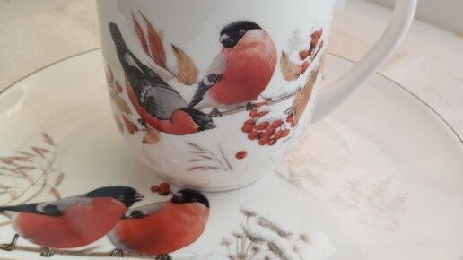 Здравствуйте, товарищи. У меня посуда. Всё началось с того, что мне двоюродная сестра на день рождения подарила кружку со снегирями. И подарила так интересно, через полгода после самого дня рождения, раньше не получалось встретиться. Как говорится, могла бы вообще не дарить - само событие давно прошло и забылось. Но она сделала мне приятное, спасибо ей большое. Тем более, что день рождения у меня первого января и значимость его теряется на фоне новогоднего праздника. А тут летом мой личный праздник с подарком...