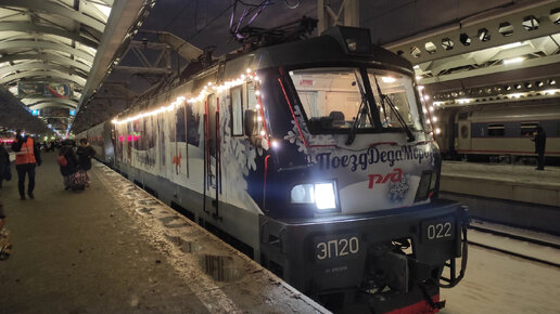 ЭП20-022 в окраске поезда Деда Мороза со скорым поездом Москва — Екатеринбург