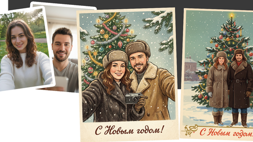 На основе загруженной фотографии создай единую иллюстрацию под винтажную советскую новогоднюю открытку. Важнейшее требование: сохрани фотографическое сходство лиц, все черты и прически людей должны остаться максимально узнаваемыми...