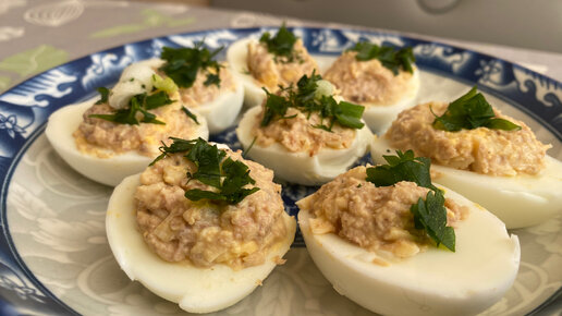 Фаршированные яйца с тунцом и сыром / вкусная закуска для праздничного стола / пп-рецепт