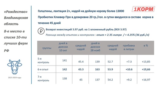 Введение живых дрожжей проходило на ферме «Рождество» в Владимирской области, которая занимает 8-е место среди 10 лучших ферм России. Эксперимент на голштинах продолжался 45 дней, такого срока хватает для оценки эффективности добавления живых дрожжей в корм КРС.