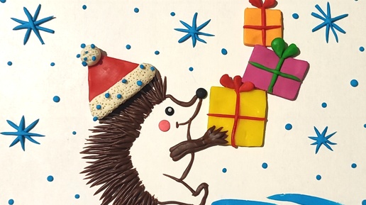 Аппликация из пластилина на картоне " Ёжик с новогодними подарками". Пошаговая инструкция по фото для детей.