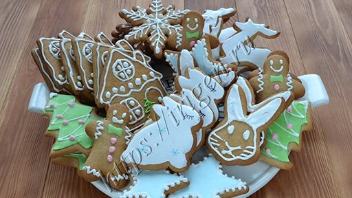 Фигурные пряники в виде елочек, снежинок, домиков и символа наступающего 2023 года – кролика. В них используется медовое пряничное тесто, из которого можно испечь не только пряники, но и мелкое печенье или пряничный домик.